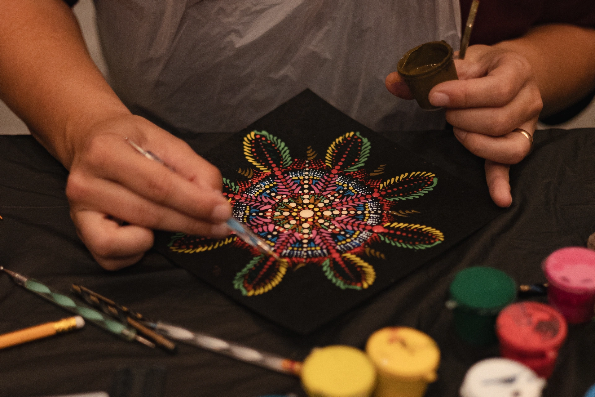 Iš taško gimstantis menas sujungia intuityvų judesį ir sąmoningą tylą. Taškavimo technika – tai terapinis kūrybos kelias, vedantis į vidinę tylą, ramybę ir buvimą čia ir dabar.